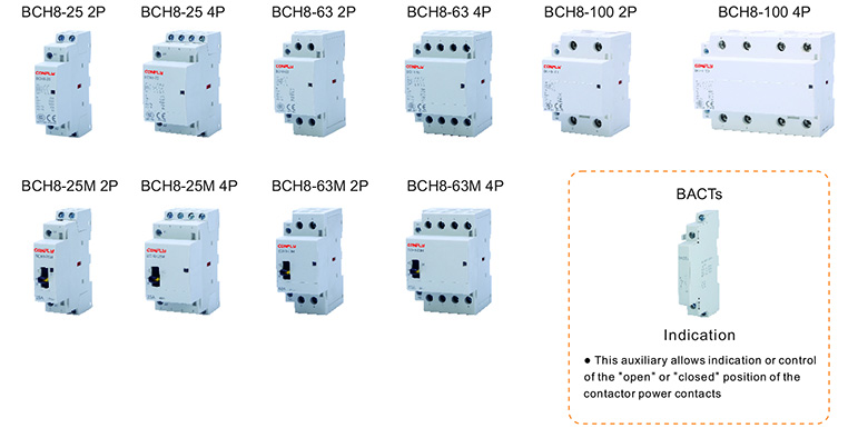 The breadth of the BCH8 contactor range satisfies the most application cases. BCH8 contactors can be combined with auxiliary control, protection and indication functions. The contactors are produced according to lEC61095(GB/T17885).